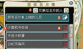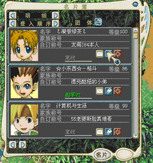 名片薄:在屏幕下端的视窗中,选择名片按钮,就能打开名片簿了。和游戏中遇到的玩家交换名片的话,那个人的名片就会登录在你的名片簿上。发信收信都非常的方便,好象现实里一样的设置,你的游戏更快乐,使你的交流更广阔。